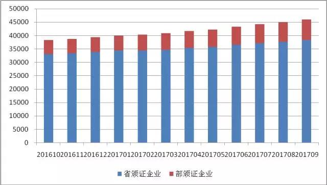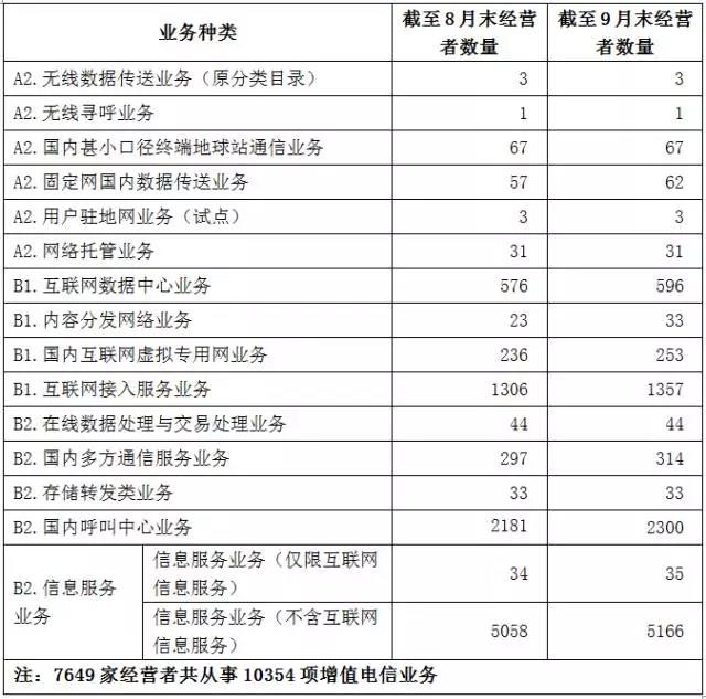 截至2017年9月底,全国增值电信业务经营许可企业共45941家,其中工业和信息化部许可的跨地区企业7649家,各省(区、市)通信管理局许可的本地企业合计38292家,较上一月分别增长1.99%、2.93%、1.81%。其中,外商投资电信企业58家。