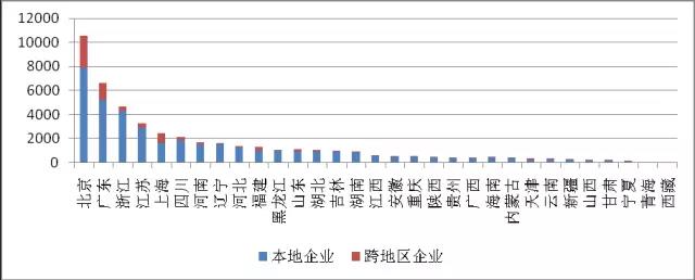 在38292家本地企业中,北京7849家,广东5191家,北京、广东两地的增值电信企业数量在全国遥遥领先,接下来依次是浙江、江苏、四川、上海等,6地集中了全国61.9%的增值电信企业,西部12省份的增值电信业务经营者仅占全国的12.6%。