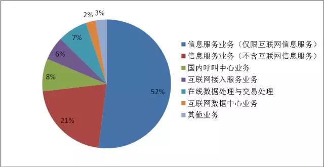 按照2015版《电信业务分类目录》中增值电信业务分类, 45941家增值电信企业合计拥有56428个许可项目。其中,29353个信息服务业务(仅限互联网信息服务),11929个信息服务业务(不含互联网信息服务),4627个国内呼叫中心业务,4210个在线数据处理与交易处理业务,3360个互联网接入服务业务(以下简称ISP),1391个互联网数据中心业务(以下简称IDC),其他业务1558个。