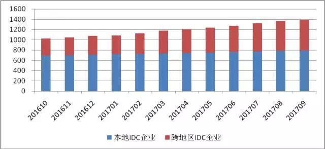 截至2017年9月底,全国IDC持证企业共1391家,其中工业和信息化部许可的跨地区企业596家,各省(区、市)通信管理局许可的本地企业合计795家,较上一月分别增长1.90%、3.47%、0.76%。