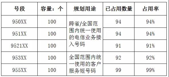 经统计,截止2017年9月30日,950XX/951XX号段已占用号码数量188个,号段占用率94%;9521XX号段已占用号码数量91个,号段占用率91%;953XX/955XX号段已占用号码数量191个,号段占用率95.5%。(详见表1)。