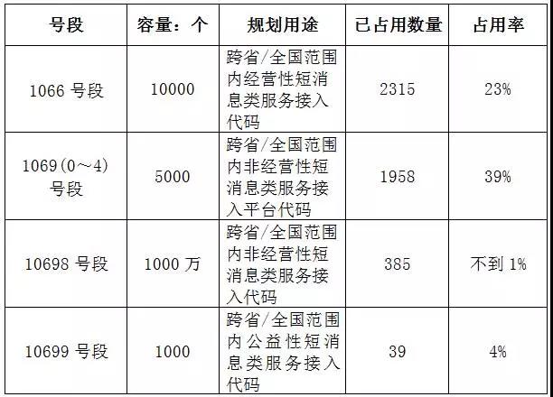 根据《电信网编号计划(2017年版)》中“106号段的具体规划”,目前工信部已启用1066号段、1069(0~4)号段、10698号段、10699号段四类跨地区短消息接入代码供各类单位申请使用。